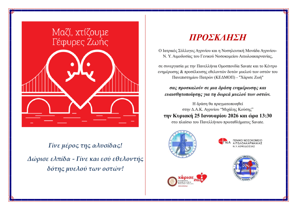Ο Ιατρικός Σύλλογος Αγρινίου και η Νοσηλευτική Μονάδα Αγρινίου Ν. Υ. Αιμοδοσίας του Γενικού Νοσοκομείου Αιτωλοακαρνανίας,