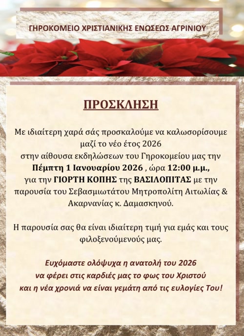 Σας περιμένουμε με χαρά και τιμή, για να υποδεχθούμε όλοι μαζί το νέο έτος 2026 με ευλογία, αγάπη και ευχές για μια χρονιά γεμάτη υγεία και θεία φώτιση.