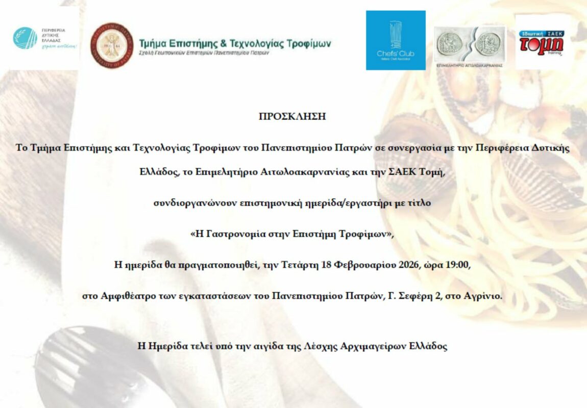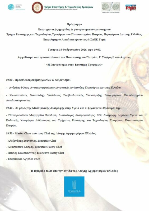 Το Τμήμα Επιστήμης & Τεχνολογίας Τροφίμων του Πανεπιστημίου Πατρών, η Περιφέρεια Δυτικής Ελλάδας, το Επιμελητήριο Αιτωλοακαρνανίας και η ΣΑΕΚ Τομή συνδιοργανώνουν ημερίδα αγροδιατροφής στο Αγρίνιο.
