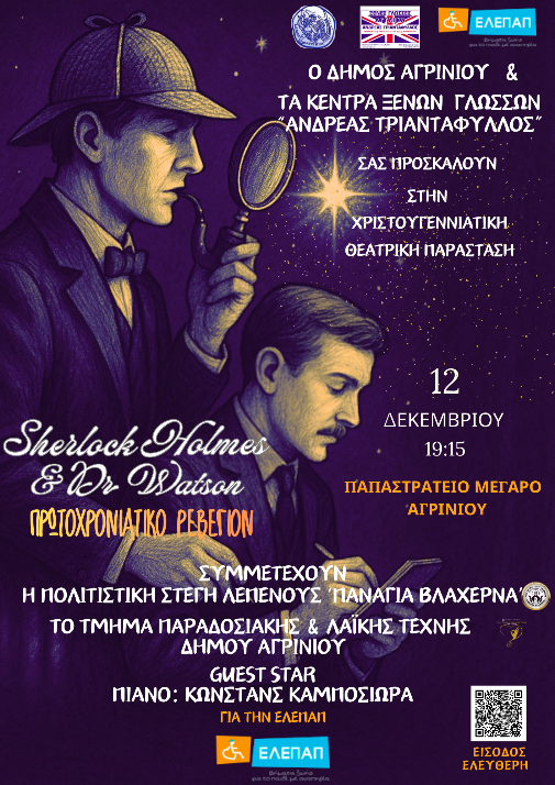 την Παρασκευή 12 Δεκεμβρίου 2025, στο Παπαστράτειο μέγαρο Αγρινίου, στις 19:15 μαζί με τα Φροντιστήρια Ξένων Γλωσσών «Ανδρέας Τριαντάφυλλος» και την ΕΛΕΠΑΠ Αγρινίου την χριστουγεννιάτικη παράσταση «Sherlock Holmes and Doctor Watson: Πρωτοχρονιάτικο Ρεβεγιόν», με σκοπό τη στήριξη των παιδιών της ΕΛΕΠΑΠ