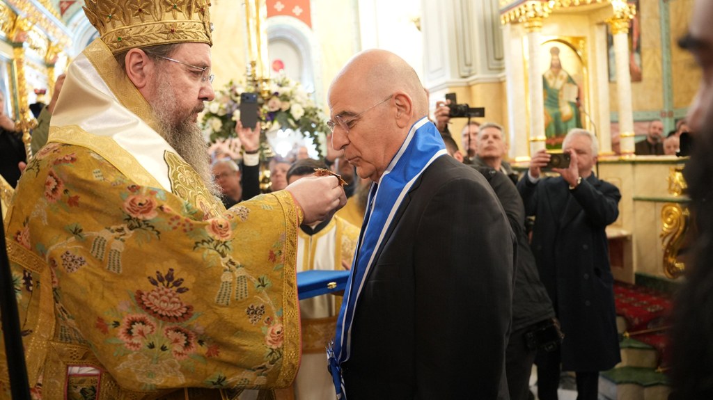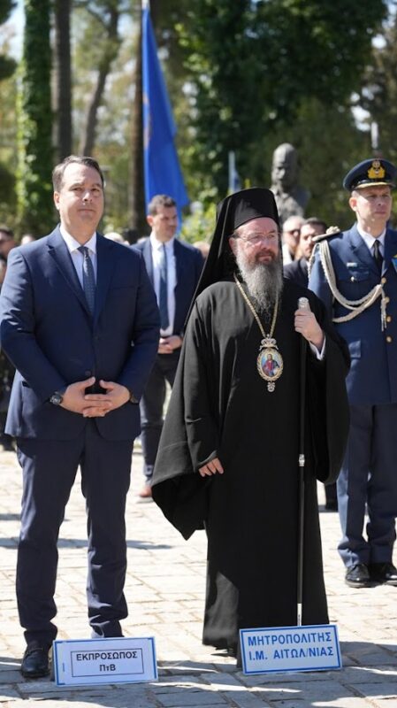 Σήμερα, σε αυτή την κορυφαία στιγμή, η Ιερά Μητρόπολις Αιτωλίας και Ακαρνανίας, προχωρά σε μια πράξη βαθιάς τιμής και ευγνωμοσύνης. Απονέμουμε στον Αξιότιμο Υπουργό Εθνικής Αμύνης, την ύψιστη τιμητική διάκριση, τον Χρυσούν Σταυρό μετά Αστέρος της επετείου των 200 ετών από την Ηρωική Έξοδο του Μεσολογγίου.
