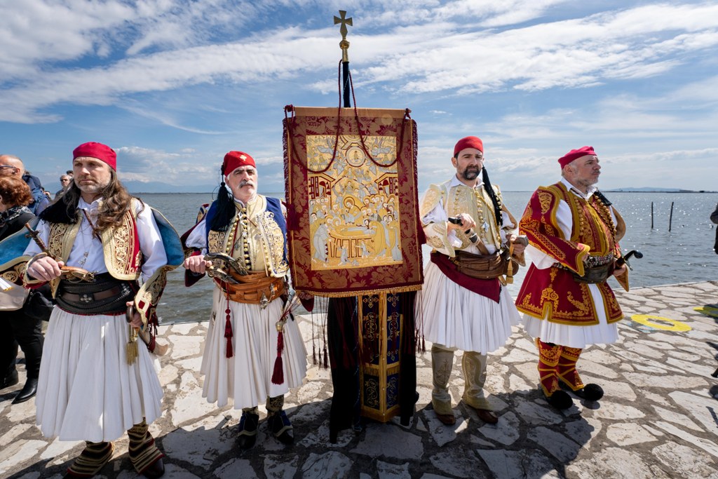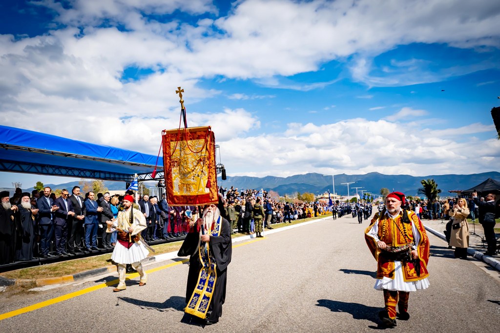 Αυτή η φλόγα σήμερα δυναμώνει. Η σημερινή πανήγυρις καθίσταται έτι λαμπροτέρα και ιστορικώς βαρύνουσα, διότι αξιούμεθα να έχουμε εν μέσω ημών  το ιερό Λάβαρο της Επαναστάσεως εκ της ιστορικής Ιεράς Μονής της Αγίας Λαύρας, το οποίο κομίζει εις την πόλιν των Ελευθέρων Πολιορκημένων το πνεύμα της θυσίας, της αυταπαρνήσεως και της θεοσέβειας των Αγωνιστών του ’21. Το Λάβαρο τούτο δεν αποτελεί απλώς ένα ιστορικό κειμήλιο, αλλά ζώσα μαρτυρία της πίστεως ενός λαού, ο οποίος γονάτισε για να προσευχηθεί — και σηκώθηκε για να ελευθερωθεί. Δεν κρατούσαν δύναμη. Κρατούσαν πίστη. Δεν είχαν βεβαιότητα νίκης. Είχαν όμως βεβαιότητα θυσίας. Και αυτή η πίστη γέννησε την ελευθερία.