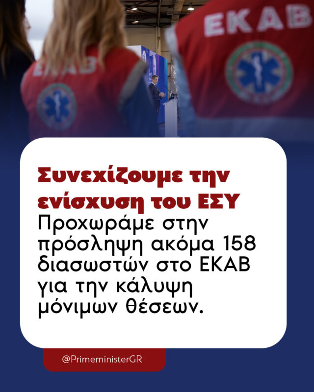 Άλλο ένα παράδειγμα ενίσχυσης του ΕΣΥ είναι η πρόσληψη άλλων 158 διασωστών στο ΕΚΑΒ για την κάλυψη μόνιμων θέσεων. Η ορκωμοσία τους έγινε προ ημερών και μπήκαν αμέσως στη «μάχη». Μόνο τον τελευταίο 1,5 χρόνο έχουμε προκηρύξει 538 μόνιμες θέσεις, ενώ τους τελευταίους τρεις μήνες εντάχθηκαν στην οικογένεια του ΕΚΑΒ 426 άτομα επικουρικό προσωπικό, εκ των οποίων οι 329 είναι πληρώματα ασθενοφόρων. Αναγνωρίζουμε τον καθημερινό αγώνα που δίνουν για να βοηθήσουν και να σώσουν ζωές. Γι’ αυτό και συνεχίζουμε την προσπάθεια για να καλύψουμε τα κενά και τις ελλείψεις που ξέρουμε ότι υπάρχουν, αλλά και για την προσαρμογή του ΕΚΑΒ στα νέα δεδομένα: με νέο στόλο, σύγχρονα πρωτόκολλα εκπαίδευσης και ψηφιακά εργαλεία που κάνουν την επέμβαση πιο γρήγορη και αποτελεσματική.