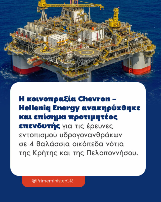 Περνάω τώρα στο κρίσιμο πεδίο της ενεργειακής μας αυτονομίας και της γεωπολιτικής ασφάλειας στην περιοχή της Ανατολικής Μεσογείου. Και επίσημα πλέον, μετά την υπογραφή της σχετικής υπουργικής απόφασης, η κοινοπραξία Chevron – Helleniq Energy ανακηρύχθηκε προτιμητέος επενδυτής για τις έρευνες εντοπισμού υδρογονανθράκων σε 4 θαλάσσια οικόπεδα νότια της Κρήτης και της Πελοποννήσου, σε μια έκταση περίπου 47.000 τετραγωνικών χιλιομέτρων. Η διαδικασία «τρέχει» γρηγορότερα από τις αρχικές εκτιμήσεις, που σημαίνει ότι προχωράμε τάχιστα. Θα ακολουθήσει η υπογραφή των συμβάσεων έρευνας και εκμετάλλευσης, στη συνέχεια ο φάκελος θα σταλεί στο Ελεγκτικό Συνέδριο για προσυμβατικό έλεγχο και, εφόσον εγκριθεί, θα υπογραφούν οι Συμβάσεις Μίσθωσης που θα τεθούν προς κύρωση από τη Βουλή. Εκτός απροόπτου, εντός του 2026 αναμένεται να ξεκινήσουν οι σεισμικές έρευνες στις συγκεκριμένες θαλάσσιες περιοχές. Η επιβεβαίωση κοιτασμάτων φυσικού αερίου από τον αμερικανικό κολοσσό θα μετατρέψει την Ελλάδα σε εναλλακτικό ενεργειακό τροφοδότη της Ευρώπης, ενισχύοντας τη θέση και τον ρόλο της στην περιοχή της Ανατολικής Μεσογείου.