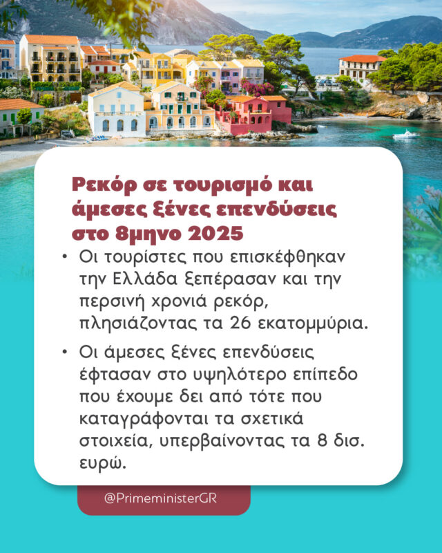 Ακόμα λίγα νέα από το οικονομικό μέτωπο: ο τουρισμός μας κινείται και φέτος σε τροχιά ρεκόρ. Σύμφωνα με τα στοιχεία της Τράπεζας της Ελλάδος, σχεδόν 26 εκ. ταξιδιώτες επισκέφθηκαν τη χώρα το πρώτο οκτάμηνο του 2025, πάνω από 1 εκ. περισσότεροι σε σχέση με την αντίστοιχη περσινή περίοδο. Πρόκειται για μια αύξηση της τάξης του 4,1%, χωρίς μάλιστα να συνυπολογίζονται όλες οι αφίξεις με κρουαζιερόπλοια. Ακόμα καλύτερη είναι η εικόνα στο μέτωπο των εισπράξεων, που μαρτυρά ότι οι επισκέπτες δαπανούν περισσότερα χρήματα, στηρίζοντας άμεσα την οικονομία και τις τοπικές κοινωνίες. Μόνο τον Αύγουστο, οι ταξιδιωτικές εισπράξεις ξεπέρασαν τα 4,5 δισ. ευρώ, ενώ στο οκτάμηνο έφτασαν τα 16,7 δισ.