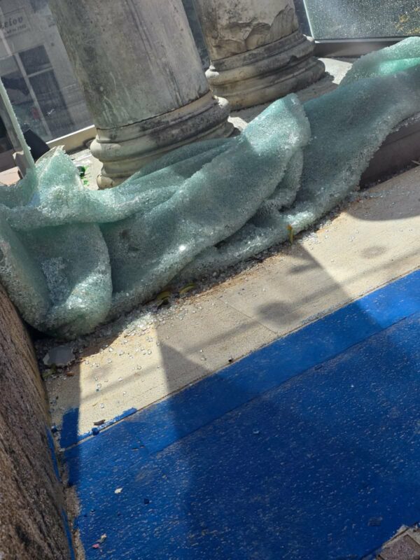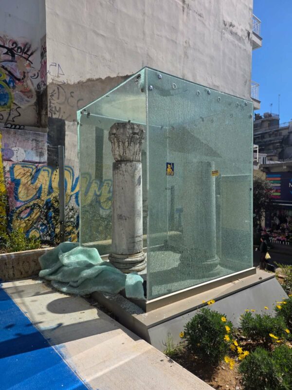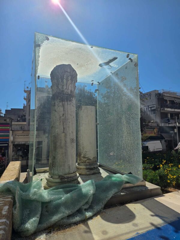 Οι φθορές στον περίβολο δεν περιορίζονται σε μεμονωμένα περιστατικά, αλλά συνθέτουν μια σοβαρή εικόνα εγκατάλειψης και αδυναμίας προστασίας ενός χώρου με θρησκευτική και ιστορική σημασία. Σπασμένα μάρμαρα διασκορπισμένα γύρω από τον ναό, ραγισμένο πλέξι γκλας στους δύο κίονες – με τις φθορές να εκτείνονται και σε πλευρικά σημεία – καθώς και διάσπαρτα γυαλιά από σπασμένα μπουκάλια, συνθέτουν μια εικόνα που, πέρα από αισθητική ζημία, εγκυμονεί κίνδυνο τραυματισμού για τους επισκέπτες και τα παιδιά που παίζουν στον χώρο.