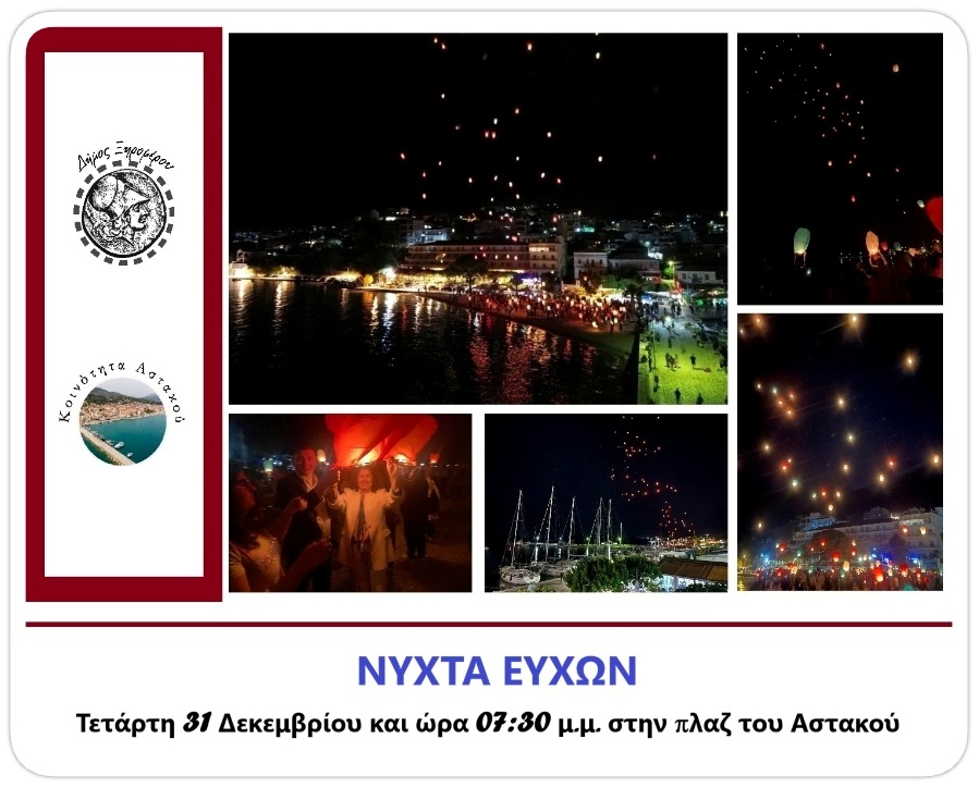 Ο Δήμος Ξηρομέρου και η Κοινότητα Αστακού, σας προσκαλούν να παραβρεθείτε τη Τετάρτη 31 Δεκεμβρίου και ώρα 07:30 μ.μ. στην πλαζ του Αστακού, σε μία “Νύχτα ευχών”, όπου όλοι μαζί θα αποχαιρετίσουμε το 2025, αναμένοντας ένα φωτεινό 2026, με υγεία και ευτυχία για όλο τον κόσμο.