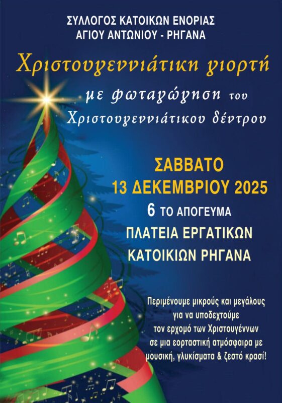 Ο Σύλλογος Κατοίκων Ενορίας Αγίου Αντωνίου – Ρηγανά διοργανώνει και φέτος τη μεγάλη του Χριστουγεννιάτικη Γιορτή, προσκαλώντας μικρούς και μεγάλους να υποδεχθούν όλοι μαζί την πιο γιορτινή περίοδο του χρόνου.