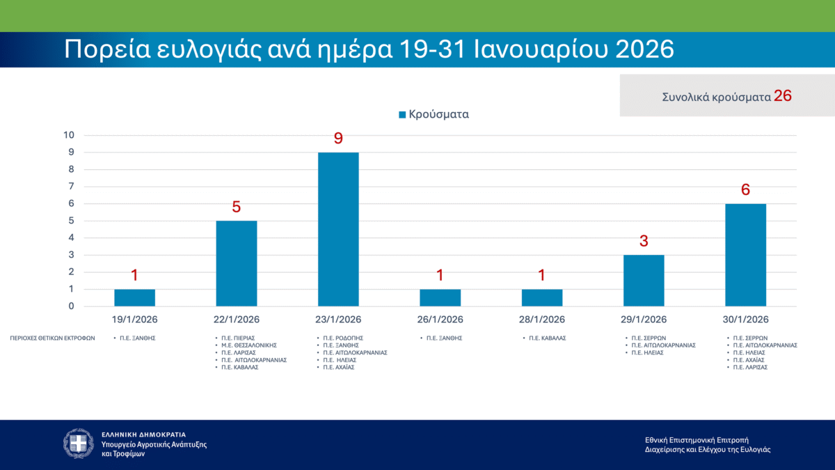 Για το διάστημα 19–31 Ιανουαρίου 2026 καταγράφονται 26 νέα κρούσματα. Η κατανομή των νέων κρουσμάτων ανά Περιφερειακή Ενότητα έχει ως εξής: