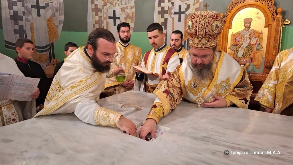Το απόγευμα της Παρασκευής, ο Γενικός Αρχιερατικός Επίτροπος, Αρχιμ. Ιωσήφ Ζωγράφος, εκ προσώπου του Σεβασμιώτατου Ποιμενάρχου μας κ. Δαμασκηνού, ο οποίος ευρισκόταν στον Αστακό για τις εκδηλώσεις για τα 200 χρόνια από την Ναυμαχία του Δραγαμέστου, μετέφερε και κατέθεσε επί της Αγίας Τραπέζης τα ιερά μαρτυρικά Λείψανα, κατά την τάξη της Εκκλησίας και κατόπιν προεξήρχε στην Ακολουθία του Εσπερινού των Εγκαινίων, με την συμμετοχή Κληρικών της πόλεως του Αγρινίου.