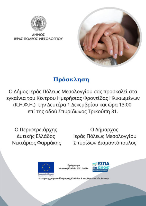 Ο Δήμος Ιερής Πόλης Μεσολογγίου έχει την τιμή να σας προσκαλέσει στην επίσημη τελετή εγκαινίων του Κέντρου Ημερήσιας Φροντίδας Ηλικιωμένων (ΚΗΦΗ), που θα πραγματοποιηθεί την Δευτέρα, 1η Δεκεμβρίου 2025 και ώρα 13:00, στην διεύθυνση Σπυρίδωνος Τρικούπη 31, στο Μεσολόγγι.
