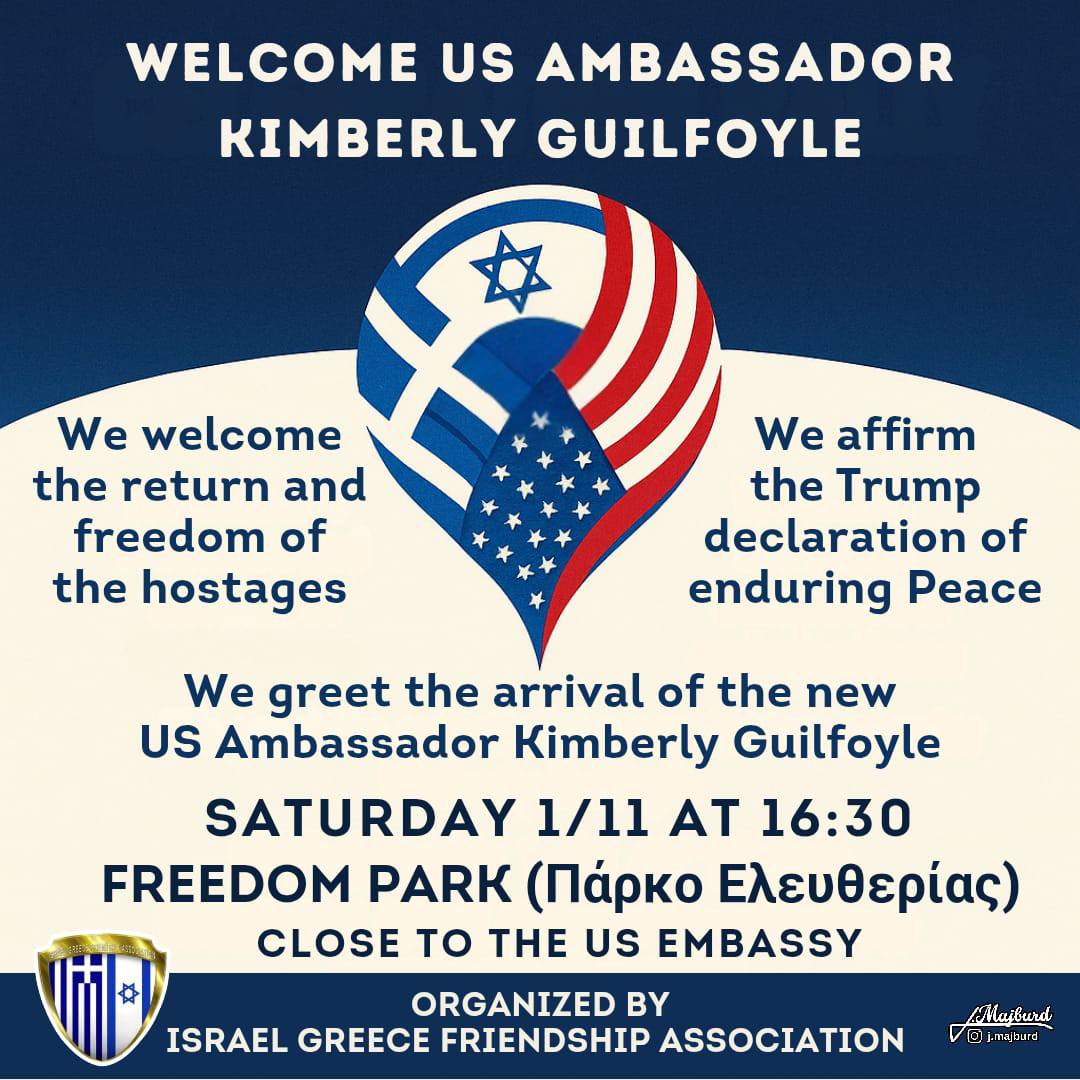 Με μήνυμα ενότητας, ειρήνης και διπλωματικής συνέχειας, το Israel-Greece Friendship Association, διοργανώνει στις 1 Νοεμβρίου, στις 16:30, εκδήλωση-συγκέντρωση στο Πάρκο Ελευθερίας, πλησίον της Αμερικανικής Πρεσβείας. Η συγκέντρωση έχει διττό συμβολισμό, τον εορτασμό της διακήρυξης ειρήνης στη Μέση Ανατολή, που επετεύχθη απο τον πρόεδρο των ΗΠΑ Ντόναλντ Τραμπ, και την υποδοχή της νέας Πρέσβειρας των Ηνωμένων Πολιτειών στην Ελλάδα, Kimberly Guilfoyle.