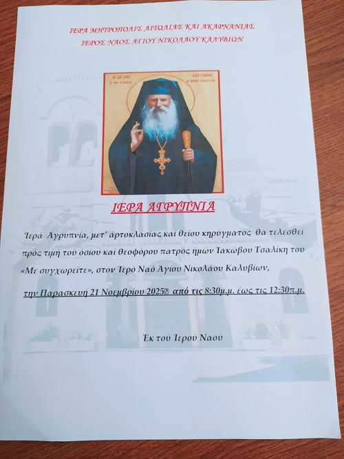 Όπως κάθε χρόνο έτσι και φέτος θα πραγματοποιηθεί Ιερά Αγρυπνία επί της εορτής του Αγίου Ιακώβου του εν Ευβοία, μετά αρτοκλασίας και θείου κηρύγματος στον ιερό ναό Αγίου Νικολάου Καλυβίων την Παρασκευή 21/11 και ώρα 20:30 μέχρι 01:00 περίπου. Θερμή παράκληση να το δημοσιεύσετε στα μέσα κοινωνικής δικτύωσης και στα social media προς ενημέρωση του κοινού.