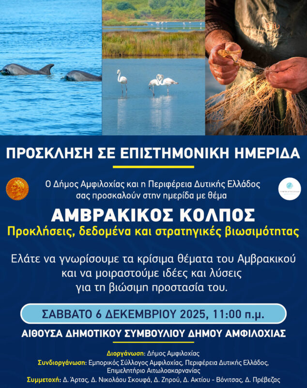 Ημερίδα με τίτλο «Αμβρακικός Κόλπος: Προκλήσεις, Δεδομένα και Στρατηγικές Βιωσιμότητας» παρουσιάζει ο Δήμος Αμφιλοχίας, ενόψει της διοργάνωσης που πραγματοποιείται το Σάββατο 6 Δεκεμβρίου στις 11:00 π.μ. στο Δημαρχείο Αμφιλοχίας. Η εκδήλωση υλοποιείται σε συνεργασία με την Περιφέρεια Δυτικής Ελλάδας, τον Εμπορικό Σύλλογο Αμφιλοχίας και το Επιμελητήριο Αιτωλοακαρνανίας.