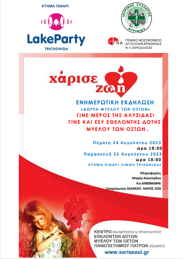 O Ιατρικός Σύλλογος Αγρινίου και η Νοσηλευτική Μονάδα Αγρινίου- Ν. Υ. Αιμοδοσίας του Γενικού Νοσοκομείου Αιτωλοακαρνανίας σε συνεργασία με το ΚΕΝΤΡΟ ΕΝΗΜΕΡΩΣΗΣ & ΠΡΟΣΕΛΚΥΣΗΣ ΕΘΕΛΟΝΤΩΝ ΔΟΤΩΝ ΜΥΕΛΟΥ ΤΩΝ ΟΣΤΩΝ ΤΟΥ ΠΑΝΕΠΙΣΤΗΜΙΟΥ ΠΑΤΡΩΝ (ΚΕΔΜΟΠ) – “Χάρισε Ζωή” διοργανώνουν ενημερωτική εκδήλωση σχετικά με τη δωρεά μυελού των οστών.