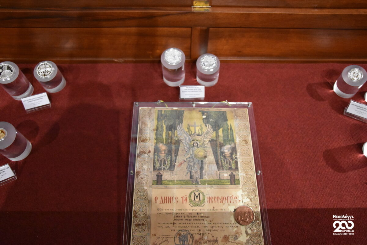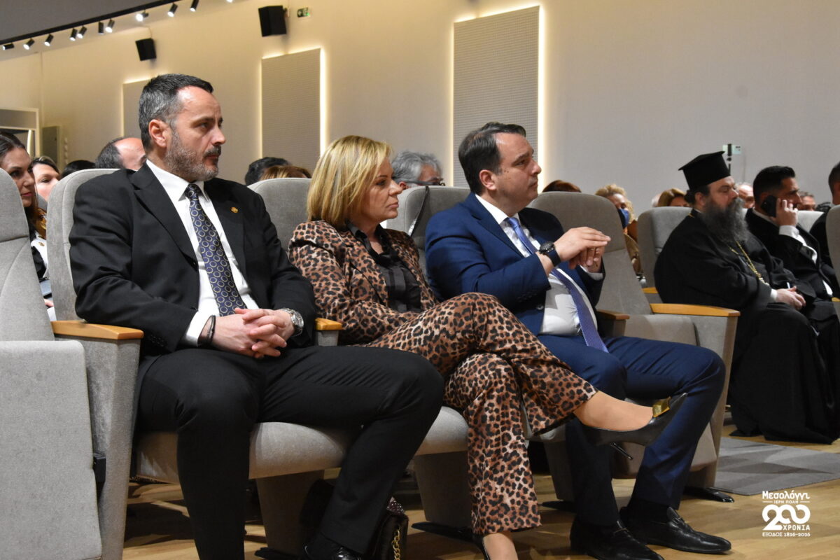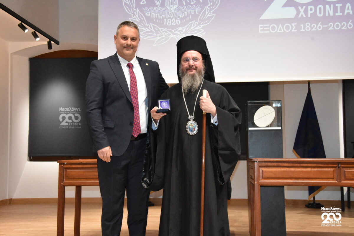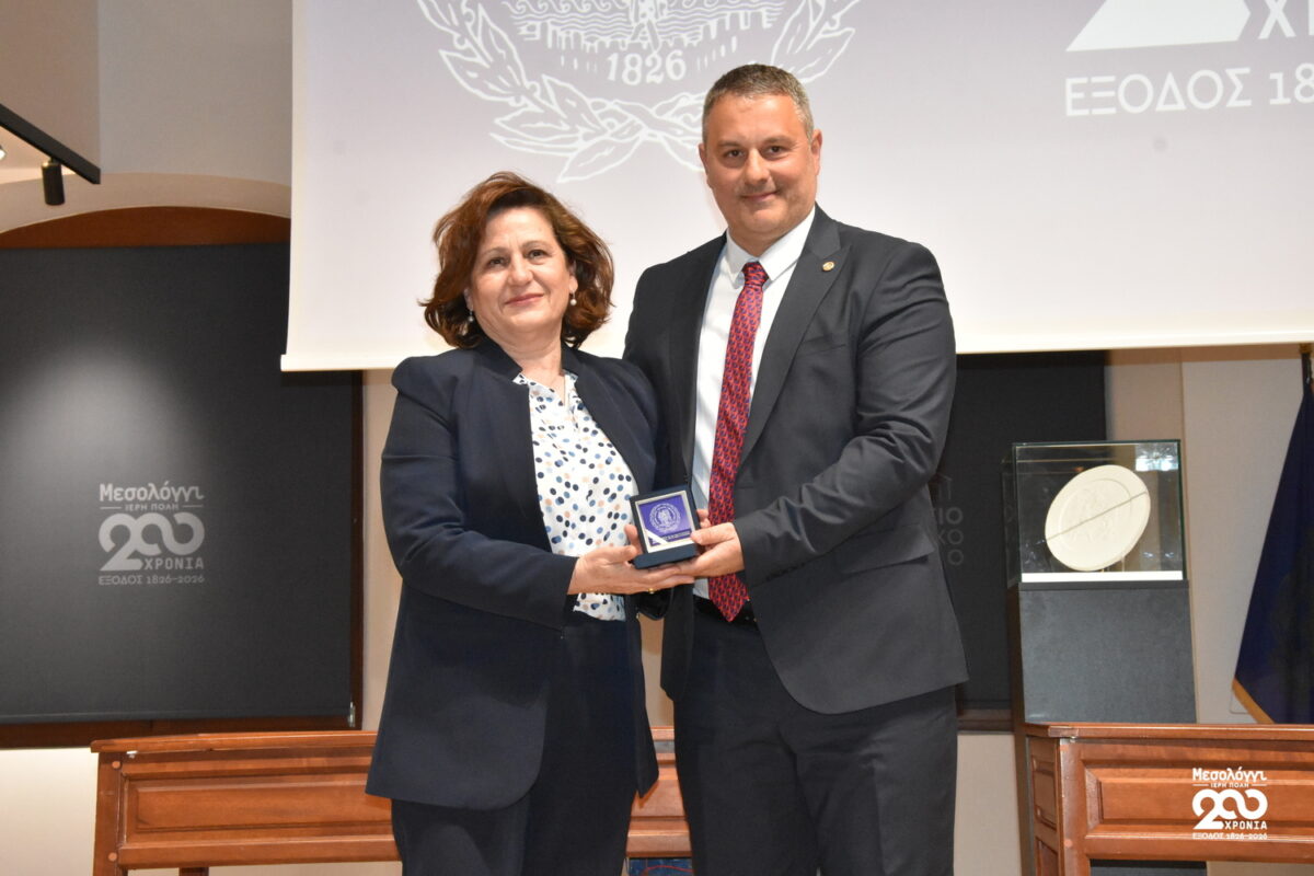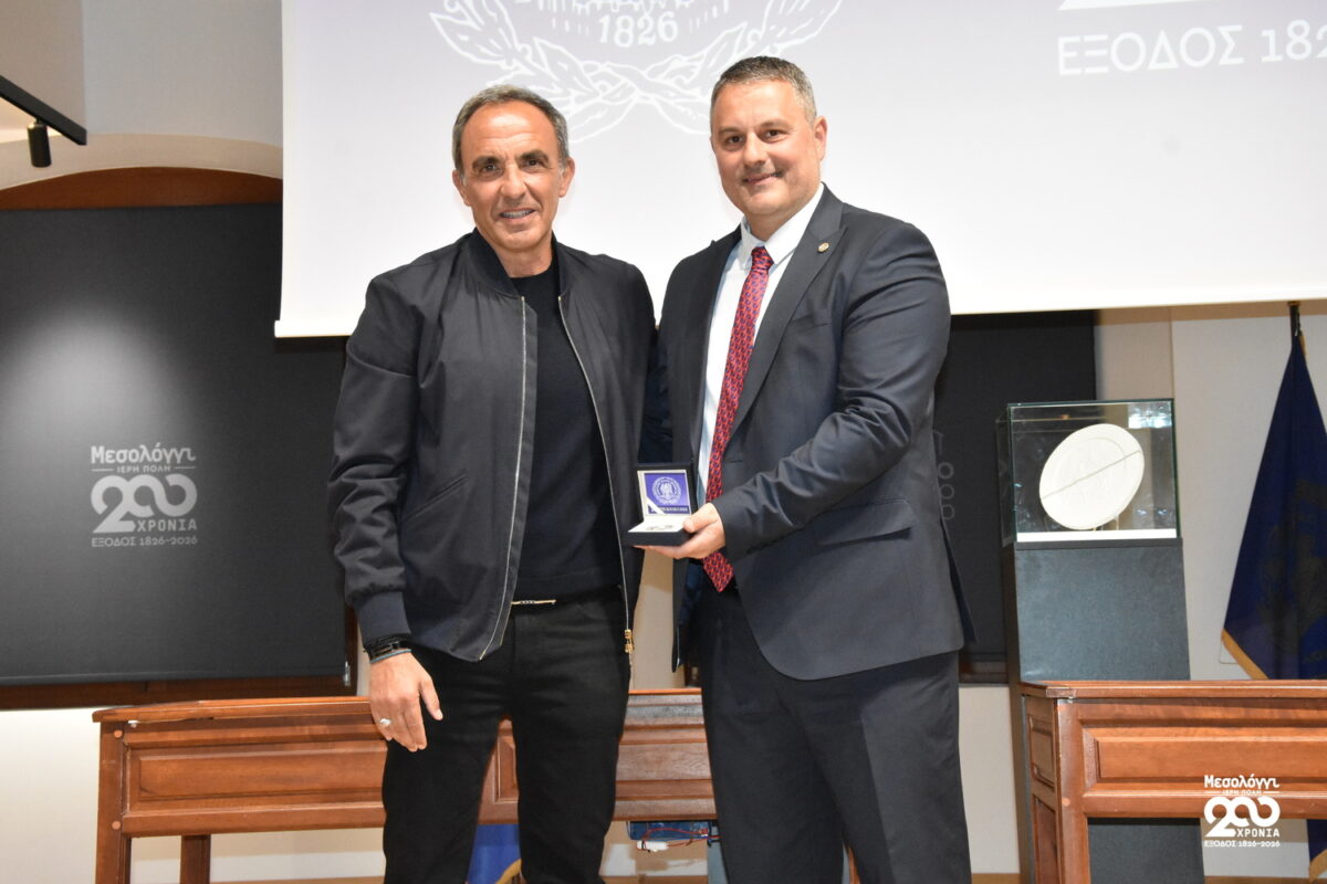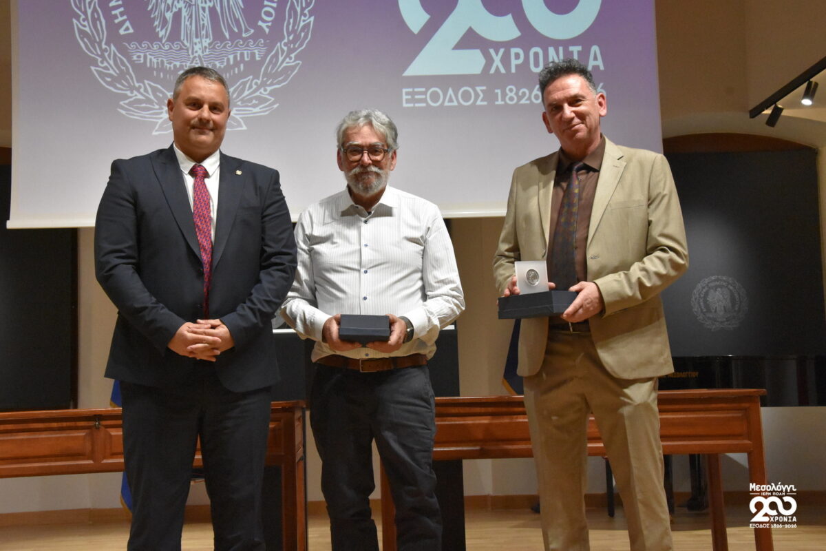 Στο πλαίσιο της εκδήλωσης, ο Δήμαρχος προχώρησε στην τιμητική απονομή του Επετειακού Μεταλλίου σε προσωπικότητες που συνέβαλαν καθοριστικά στην προβολή της επετείου. Με το μετάλλιο τιμήθηκαν ο Σεβασμιώτατος Μητροπολίτης κ.κ. Δαμασκηνός, ο Αντιπεριφερειάρχης κ. Θανάσης Μαυρομμάτης, η Γενική Διευθύντρια Αρχαιοτήτων και Πολιτιστικής Κληρονομιάς του υπουργείου Πολιτισμού κα Ολυμπία Βικάτου, ο κ. Νίκος Αλιάγας και ο καλλιτέχνης κ. Γιώργος Σταματόπουλος, ως αναγνώριση της έμπρακτης προσφοράς τους στην ανάδειξη του εφετινού ιστορικού ορόσημου. Η βραδιά ολοκληρώθηκε με την κοινή δέσμευση όλων των παρευρισκομένων ότι το 2026 θα αποτελέσει ένα έτος παγκόσμιας αναφοράς, με το Μεσολόγγι στο επίκεντρο του ενδιαφέροντος. Τα επετειακά νομίσματα και το λεύκωμα θα αποτελέσουν τη ζωντανή παρακαταθήκη αυτής της μεγάλης επετείου, διατηρώντας άσβεστη τη μνήμη της ηρωικής πράξης που συγκλόνισε την ανθρωπότητα.