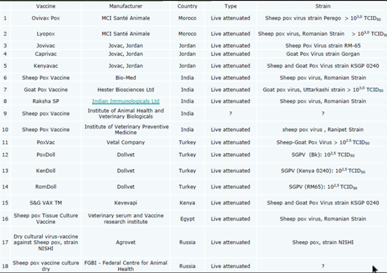 1. Η εισαγωγή εμβολίων της ευλογιάς των αιγοπροβάτων είναι παράνομη, καθώς δεν δεν έχει εγκριθεί οποιοδήποτε σχετικό σκεύασμα. Σύμφωνα με τον Νόμο 5184/2025  (ΦΕΚ Α’ 34/06.03.2025), ένα σκεύασμα (όπως το εμβόλιο της ευλογιάς) θεωρείται παράνομο και η διακίνηση του επιφέρει κυρώσεις όταν διατίθεται με οποιονδήποτε τρόπο χωρίς την άδεια κυκλοφορίας που απαιτείται από την κείμενη νομοθεσία. Στη χώρα μας, δεν έχουν εγκριθεί-αδειοδοτηθεί κτηνιατρικά ανοσολογικά σκευάσματα (εμβόλια) για την ευλογιά. Στην εικόνα 3 υπάρχει κατάλογος εμβολίων ευλογιάς που χρησιμοποιούνται σε τρίτες χώρες.