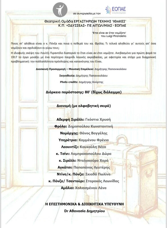 H Θεατρική Ομάδα «Ιθάκες» του ΚΠ «Οδυσσέας» ΠΕ Αιτωλοακαρνανίας – ΕΟΠΑΕ παρουσιάζει το Σάββατο 18 Οκτωβρίου την παράσταση «Έτσι είναι αν έτσι νομίζετε» του Luigi Pirandello.