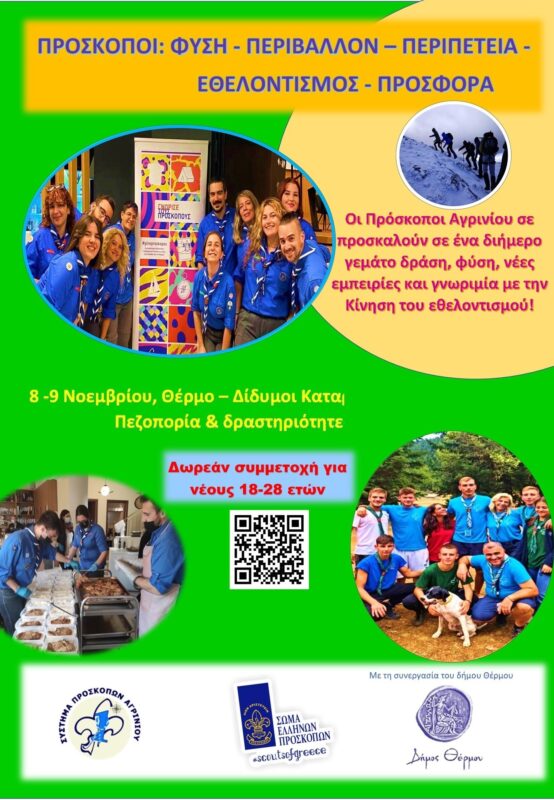 «Είσαι φοιτητής ή νέος 18–28 ετών; Αγαπάς τη φύση, την περιπέτεια και την καλή παρέα; Τότε αυτή η εμπειρία είναι για σένα! Οι Πρόσκοποι Αγρινίου σε προσκαλούν σε ένα μοναδικό διήμερο γνωριμίας με τον Προσκοπισμό, στις 8 και 9 Νοεμβρίου στο κατασκηνωτικό κέντρο Αγίας Σοφίας Θέρμου.