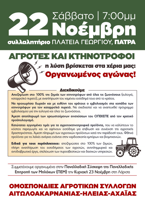 Παίρνουμε όλοι μέρος στο μεγάλο κοινό συλλαλητήριο αγροτών και κτηνοτρόφων, το Σάββατο 22 Νοέμβρη, στις 7μμ, στην πλατεία Γεωργίου στην Πάτρα. Λεωφορείο θα αναχωρήσει στις 5μμ, από το δημοτικό πάρκο στο Αγρίνιο.
