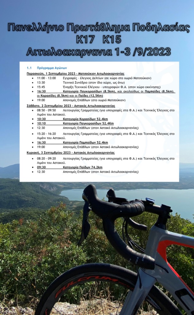 Η Ελληνική Ομοσπονδία Ποδηλασίας και ο Ποδηλατικός Όμιλος Πατρών με την υποστήριξη της Περιφέρειας Δυτικής Ελλάδος, του Δήμου Αγρινίου και του Δήμου Ξηρόμερου, διοργανώνει το Πανελλήνιο Πρωτάθλημα Ποδηλασίας Δρόμου για την αγωνιστική περίοδο 2023, στις κατηγορίες Κ17 (Παίδων – Κορασίδων) και Κ15 (Παμπαίδων – Παγκορασίδων), στην Περιφερειακή Ενότητα Αιτωλοακαρνανίας.